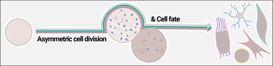 La division cellulaire asymétrique est le processus par lequel une cellule mère peut générer deux cellules filles ayant des destins cellulaires différents. Ce processus repose notamment sur la distribution inégale de composants cellulaires, ce qui confère une identité propre à chaque cellule fille. Entre autres, plusieurs de ces facteurs de détermination du destin cellulaire sont des organites essentiels. Cela inclut les lysosomes, les mitochondries et les autophagosomes, qui sont indispensables au maintien homéostatique de la cellule.